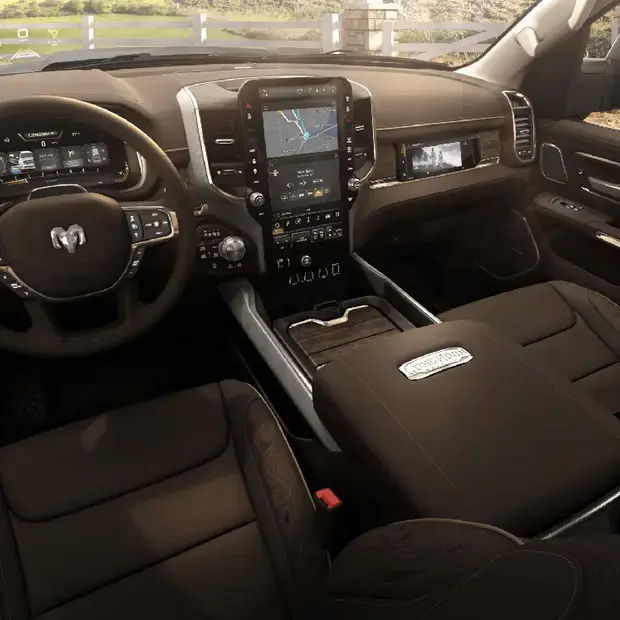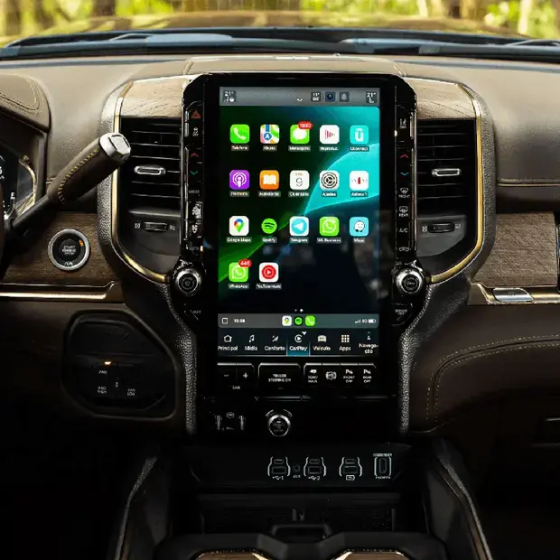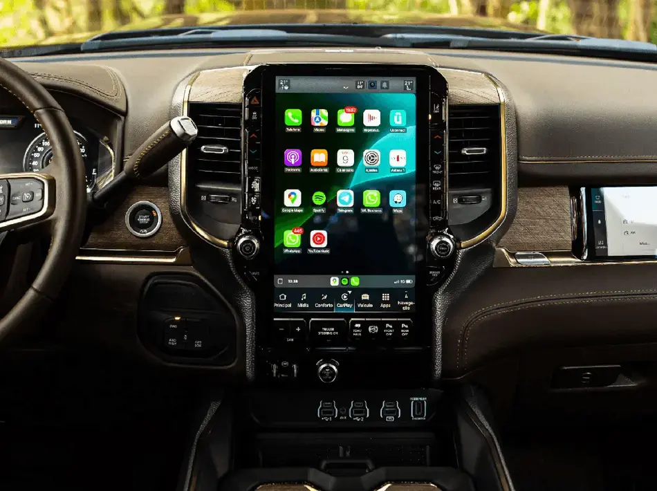 Para a maior picape, a maior central multimídia. A 5ª geração do sistema Uconnect possui Android Auto e Apple Car Play com conexão sem fio, navegação embarcada, conexão com até 2 smartphones e possibilidade de personalização e divisão da tela.